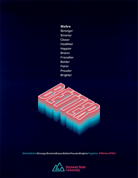 A fresh brand brings forth a collection of eight distinct banner designs that grace the five campuses of Vermont State, seamlessly uniting them and creating a sense of home, regardless of which campus you step onto.